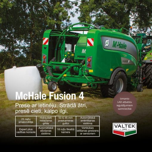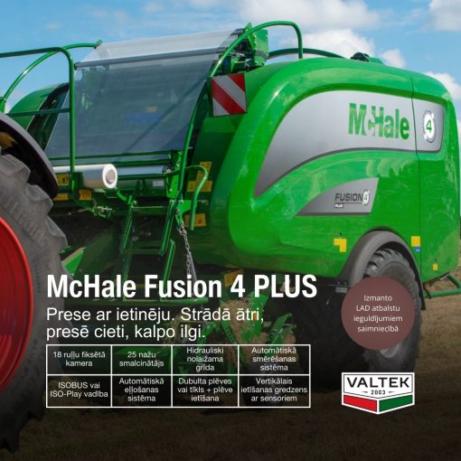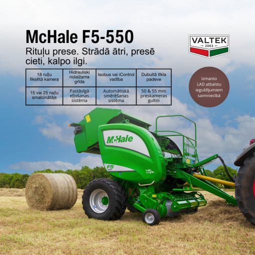 🟢 McHale ruļļu preses un kombainētās preses — augstas kvalitātes ruļļu preses, tostarp McHale F5 sērijas preses un Fusion 4 kombinētās preses, kas nodrošina efektīvu lopbarības sagatavošanu.