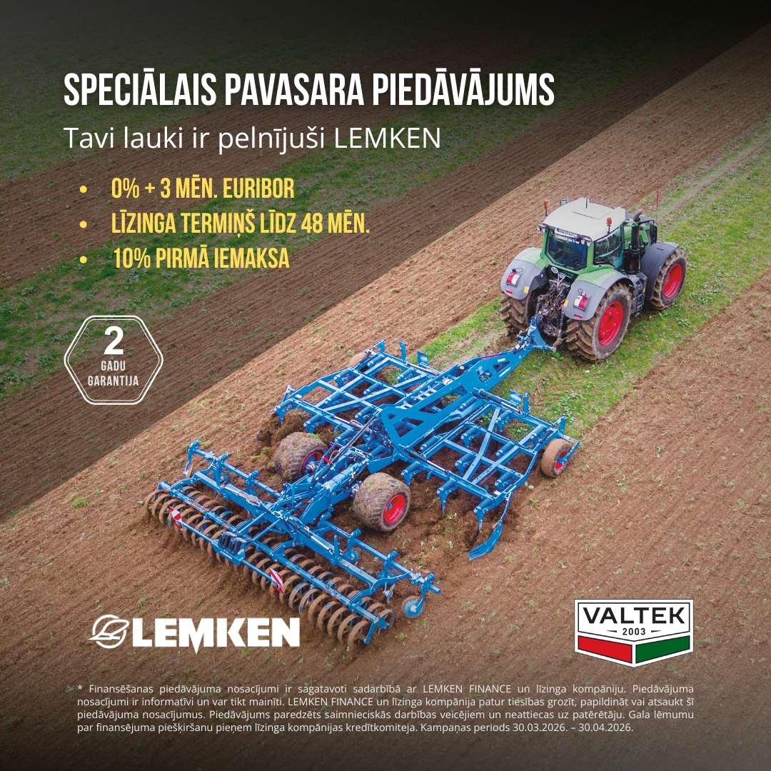 * Finansēšanas piedāvājuma nosacījumi ir sagatavoti sadarbībā ar LEMKEN FINANCE un līzinga kompāniju. Piedāvājuma nosacījumi ir informatīvi un var tikt mainīti. LEMKEN FINANCE un līzinga kompānija patur tiesības grozīt, papildināt vai atsaukt šī piedāvājuma nosacījumus. Piedāvājums paredzēts saimnieciskās darbības veicējiem un neattiecas uz patērētāju. Gala lēmumu par finansējuma piešķiršanu pieņem līzinga kompānijas kredītkomiteja. Kampaņas periods 30.03.2026. – 30.04.2026.